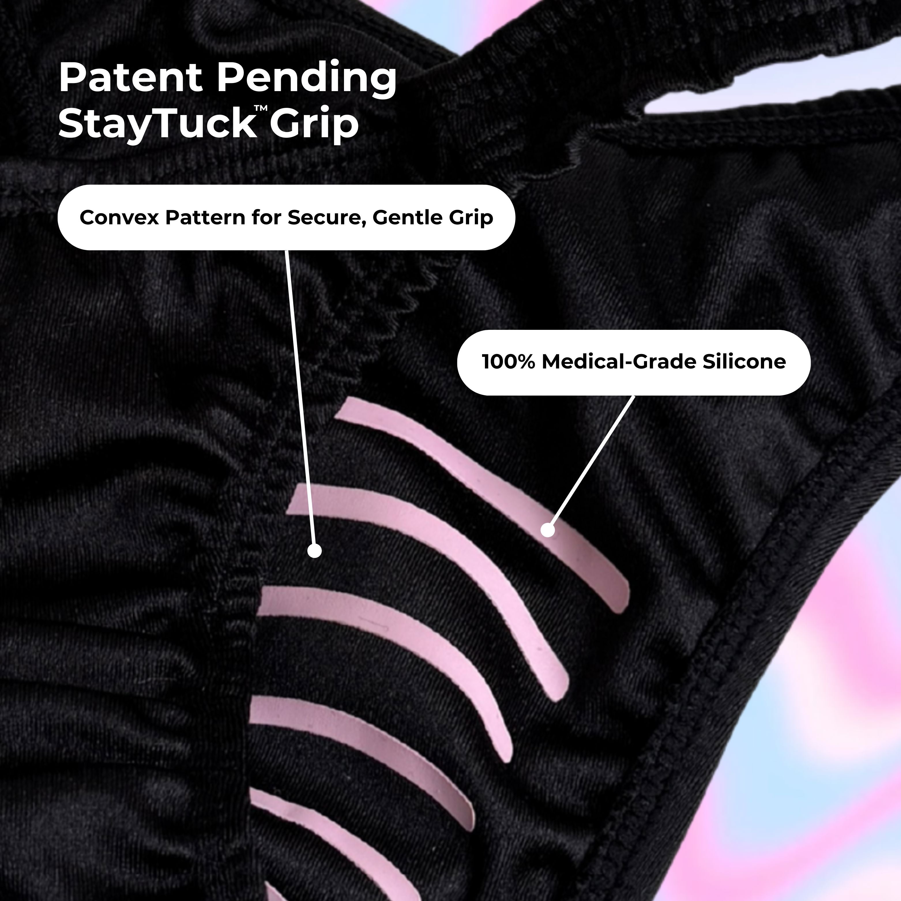 StayTuck™ Grip is our patent-pending, latex-free silicone gusset application. We engineered a unique convex-up orientation that mirrors your body’s natural curves. This anatomical arch "cups" the tuck to distribute tension evenly, providing a secure hold that prevents slipping and suppresses unwanted erections without the need for heavy compression.