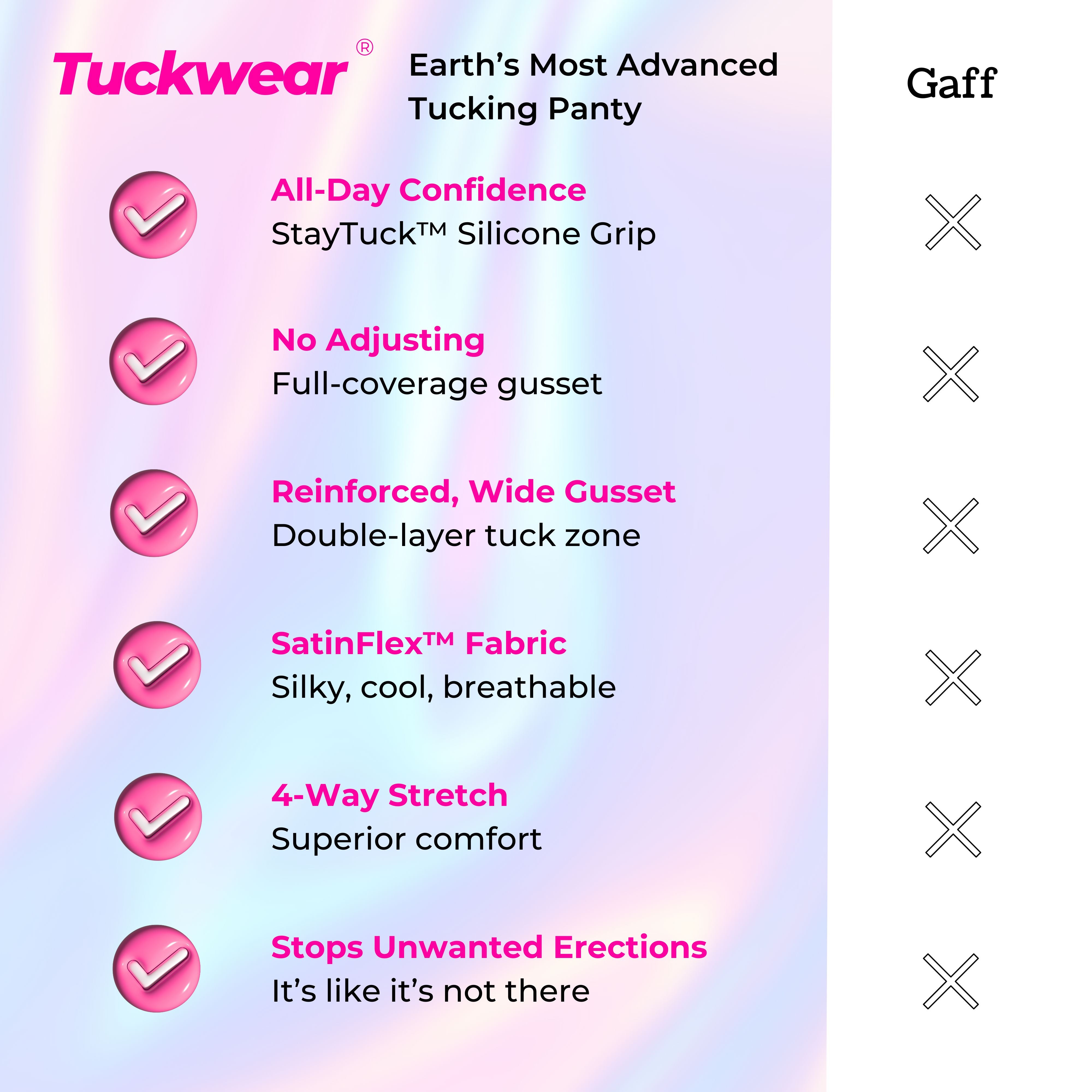 Not Your "Tranma’s" Gaff – We don't do rolling, shifting, pinching, or crushing compression. Tuckwear is a new category of underwear designed to be the comfortable, high-hold alternative to Tuck Kit & QuickTuck. It’s the effortless, adhesive-free way to tuck every day.