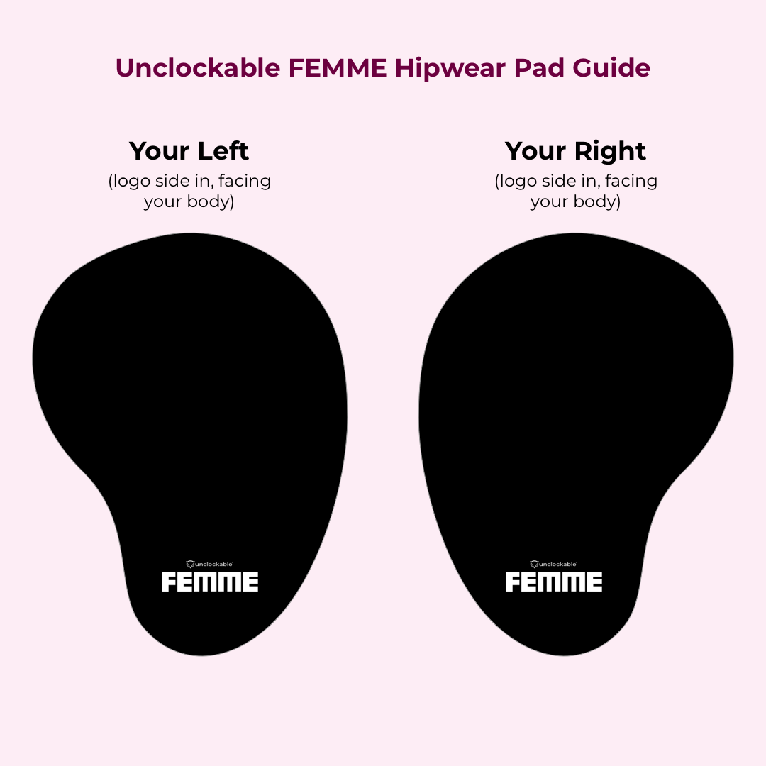 • To ensure the most comfortable fit, avoid rolling the sides of your Hipwear when putting them on and taking them off. After washing & air drying the pads, or when putting the pads back in after removing them, ensure the side with the FEMME logo is facing your body. The pads for left and right are different. Please refer to our Hipwear Pad Guide below to know which is which.