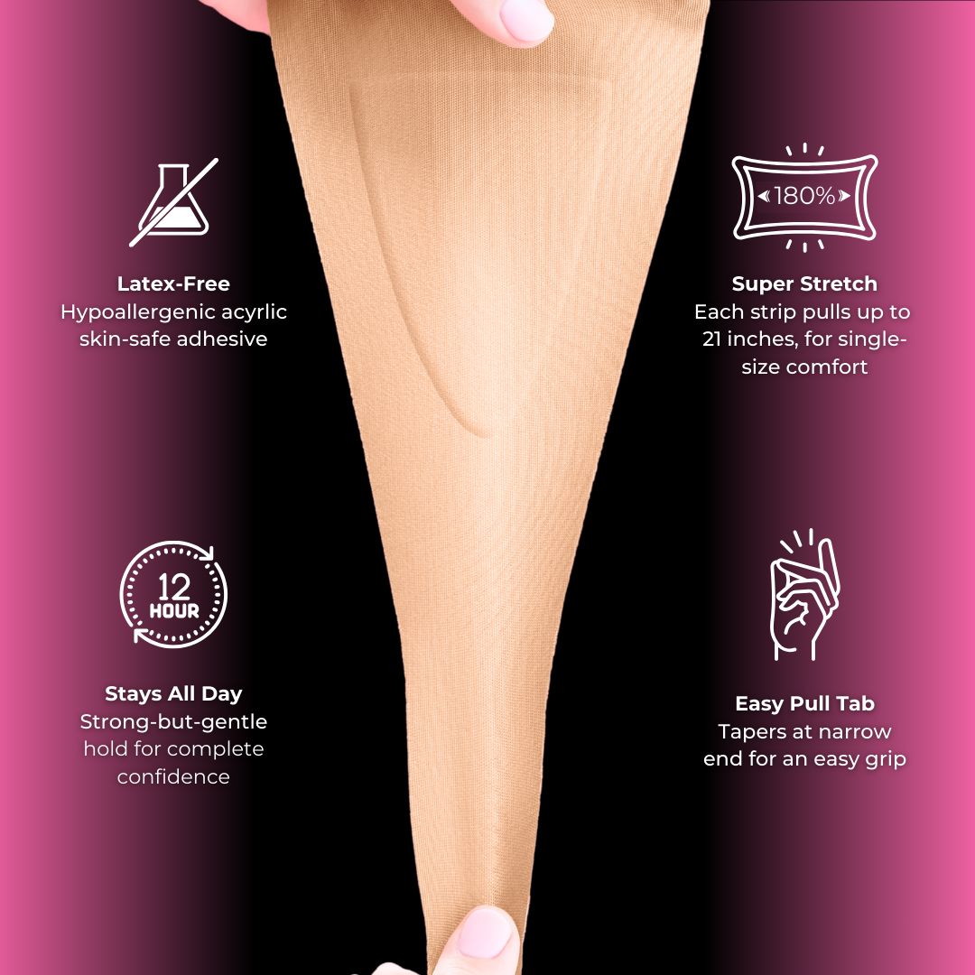 With QuickTuck, stay securely & comfortably tucked flat for up to 12 hours. Swim-proof, gym-proof, life-proof. Each single-use strip is designed for incredible comfort with a strong-but-gentle hold, and easy removal for as many as three bathroom breaks per wear. Stays in place through yoga, swim or other intense exercise. Hypoallergenic. Latex free. Designed in The USA. Seeing is believing.